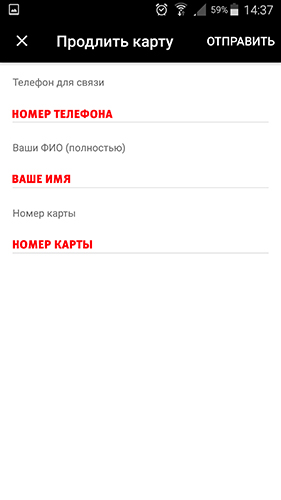 Продление карты: Вписывайте номер карты и нажимаете кнопку в правом верхнем углу «Отправить» и менеджер клуба свяжется с вами в ближайшее время.