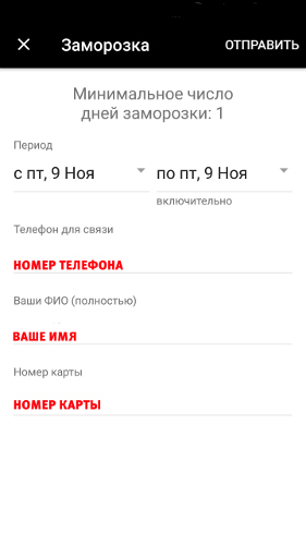 Заморозка карты: устанавливаете срок заморозки и вписываете номер вашей карты и нажимаете кнопку в правом верхнем углу «Отправить» и менеджер клуба свяжется с вами в ближайшее время.